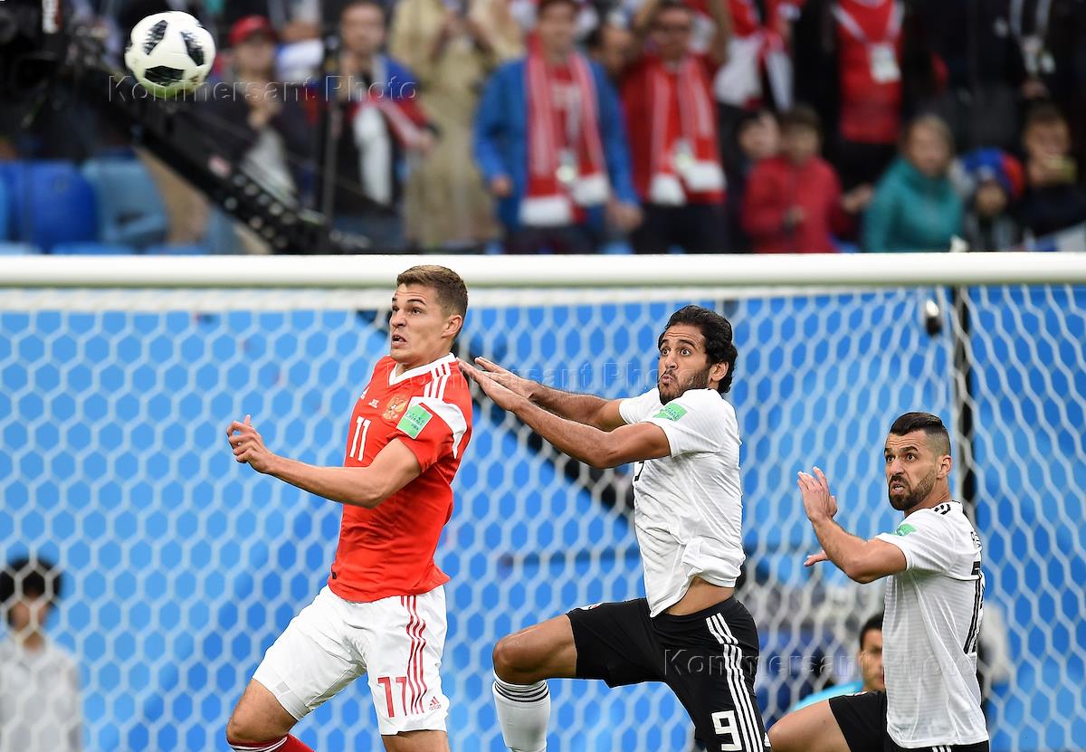 FIFA World Cup 2018 Russia. Group A. Russia v Egypt at the "Saint-Peterburg" stadium. Russian football playe Artyom Dzuba (left) and Egyptian players Mohamed Abdel Shafy and Trezeguet during the match.