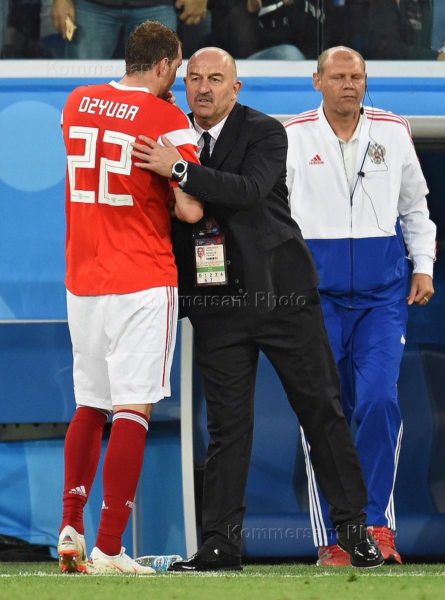 FIFA World Cup 2018 Russia. Group A. Russia v Egypt at the "Saint-Peterburg" stadium. The mian coach of Russian football team Stanislav Cherchesov with Artyom Dzuba after the match.