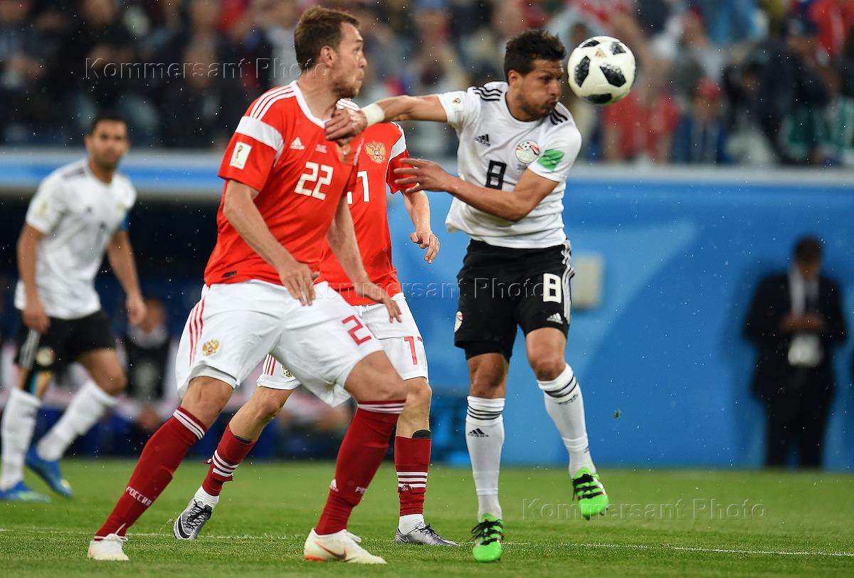 FIFA World Cup 2018 Russia. Group A. Russia v Egypt at the "Saint-Peterburg" stadium. Russian football playe Artyom Dzuba (left) and Egyptian players Mohamed Abdel Shafy and Trezeguet during the match.