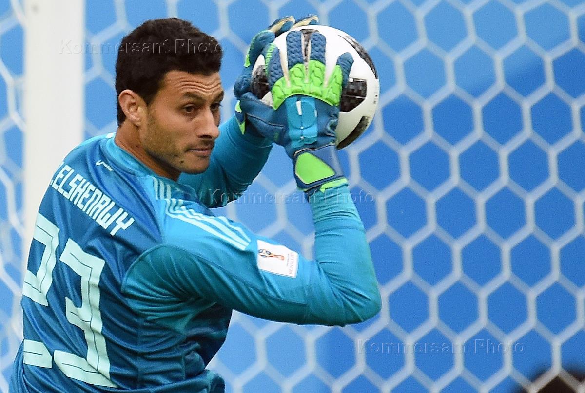 Чемпионат мира по футболу в России FIFA-2018. Групповой этап. Матч между сборными командами России и Египта на стадионе "Санкт-Петербург". Вратарь сборной Египта Мохамед Аш-Шенави (справа) во время матча.