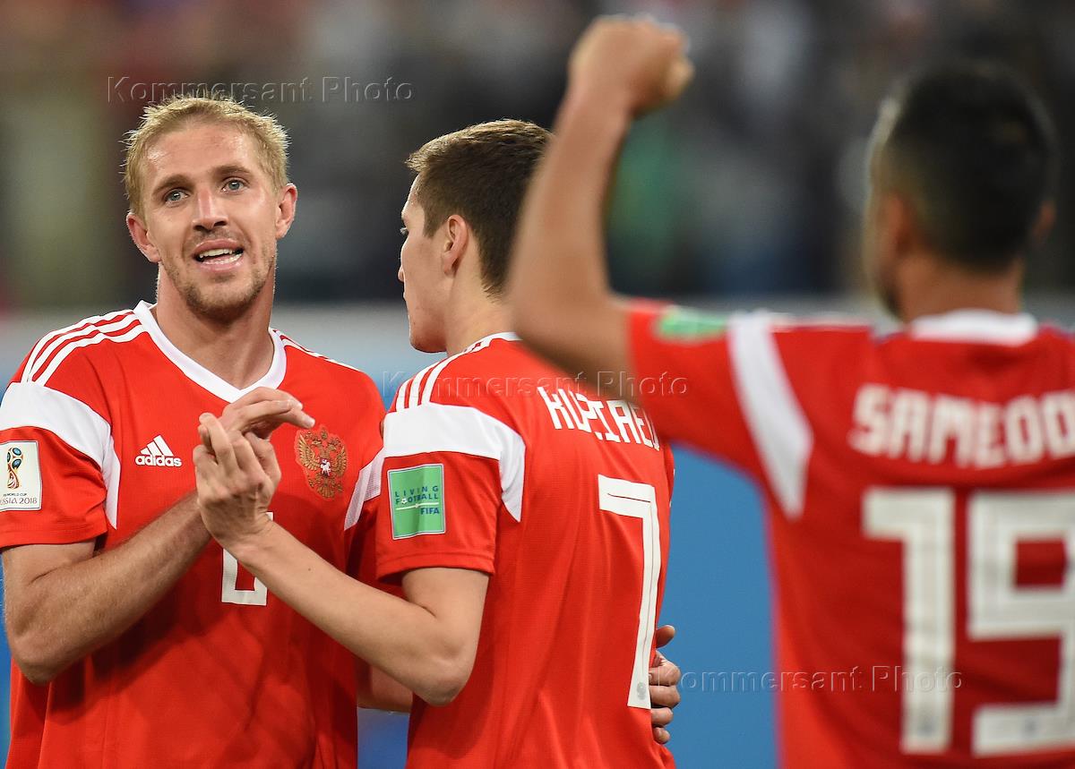 FIFA World Cup 2018 Russia. Group A. Russia v Egypt at the "Saint-Peterburg" stadium. Russian football players Roman Zobnin (left) and Sergey Ignashevich (center) during the match.