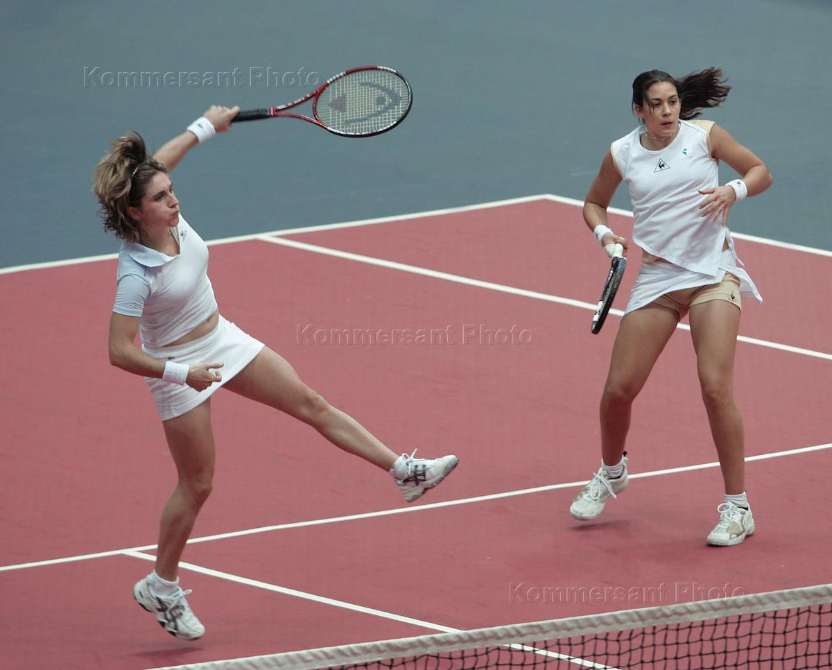 Французские теннисистки Эмили Луа и Марион Бартоли во время чемпионата мира по теннису среди женских сборных команд "Кубка Федерации - 2004". Матч прошел в помещении Крытого конькобежного центра в Крылатском.