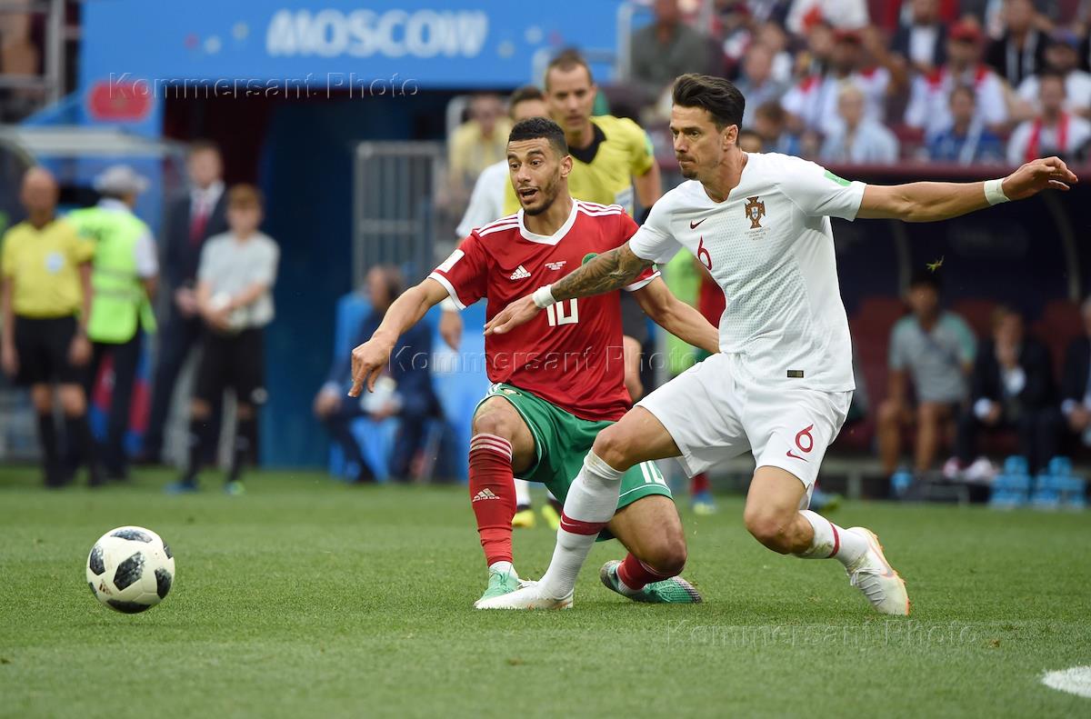 Чемпионат мира по футболу в России FIFA-2018. Групповой этап. Матч между сборными командами Португалии и Марокко на стадионе "Лужники". Игрок сборной Португалии Жозе Фонте (справа) и игрок сборной Марокко Юнес Беланда (слева) во время матча.