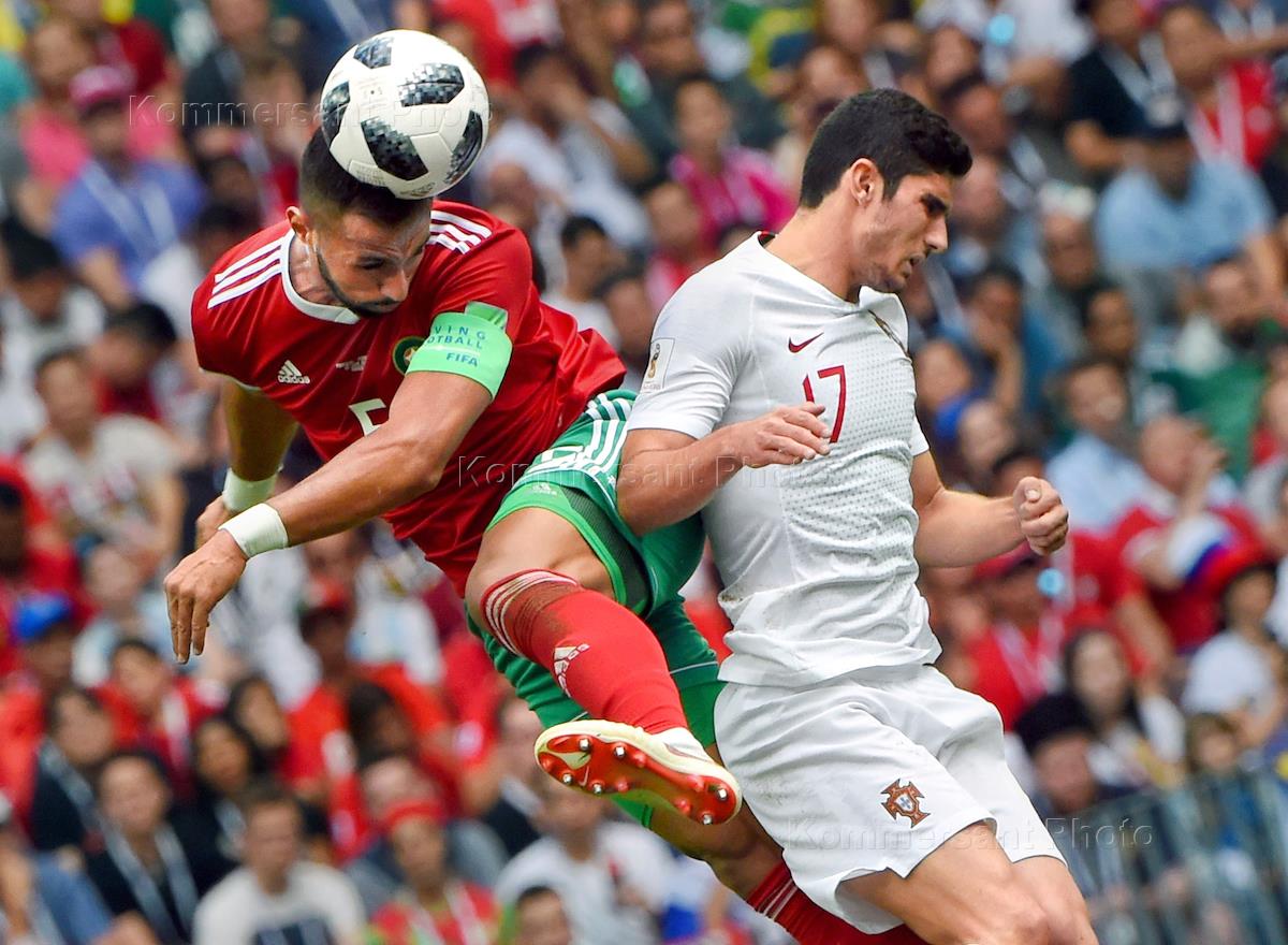 Чемпионат мира по футболу в России FIFA-2018. Групповой этап. Матч между сборными командами Португалии и Марокко на стадионе "Лужники". Игрок сборной Португалии Гонсалу (справа) и игрок сборной Марокко Меди Бенатиа (слева) во время матча.