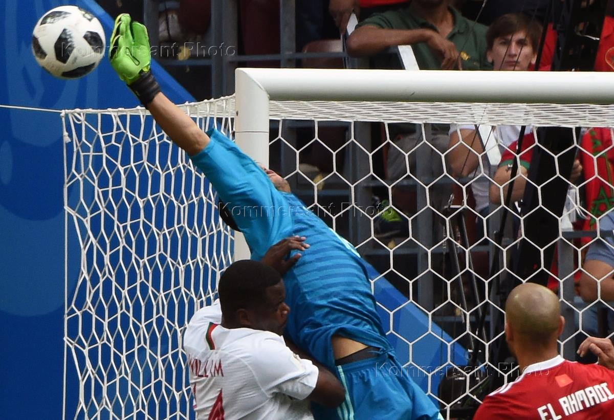Чемпионат мира по футболу в России FIFA-2018. Групповой этап. Матч между сборными командами Португалии и Марокко на стадионе "Лужники". Вратарь сборной Марокко Мунир эль-Кажуи (в центре) во время матчаю