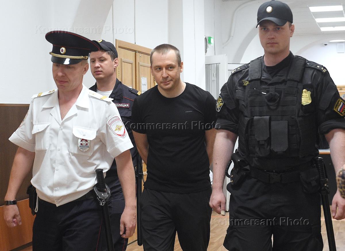 Бывший заместитель начальника управления "Т" Главного управления экономической безопасности и противодействия коррупции МВД России Дмитрий Захарченко (справа), обвиняемый в получении взяток, перед началом заседания Басманного районного суда.