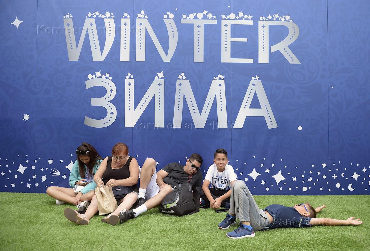 Чемпионат мира по футболу в России FIFA-2018. Семья иностранных болельщиков в Парке футбола на Красной площади.