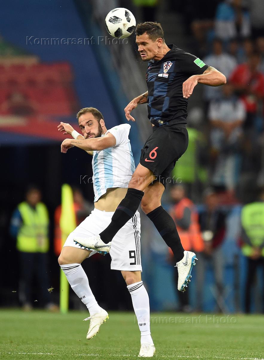 Чемпионат мира по футболу в России FIFA-2018. Групповой этап. Матч между сборными Аргентины и Хорватии на стадионе "Нижний Новгород". Игрок сборной Хорватии Деян Ловрен (справа) и игрок сборной Аргентины Гонсало Игуаин (слева) во время матча.