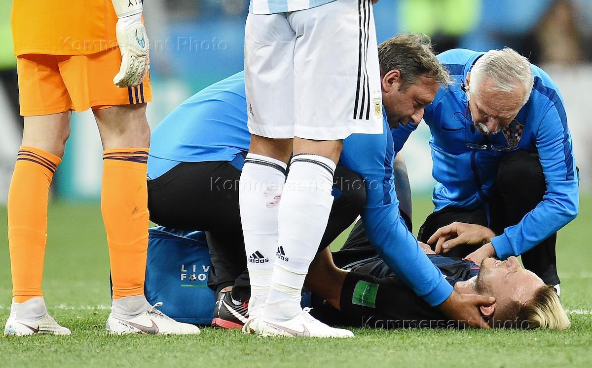 Чемпионат мира по футболу в России FIFA-2018. Групповой этап. Матч между сборными командами Аргентины и Хорватии на стадионе "Нижний Новгород". Врачи оказывают помощь игроку сборной Хорватии Ивану Ракитичу во время матча.