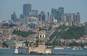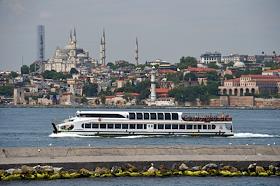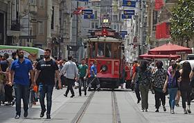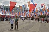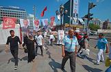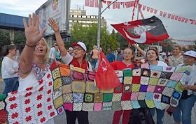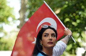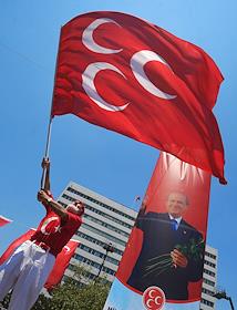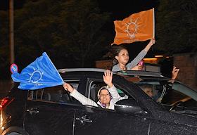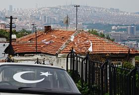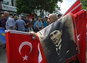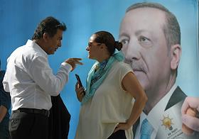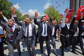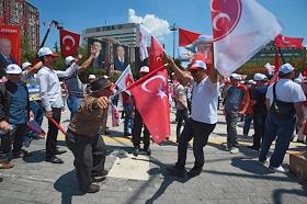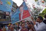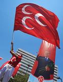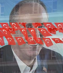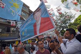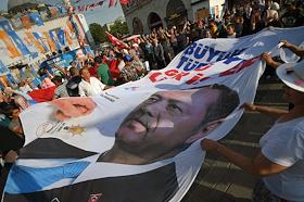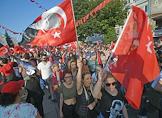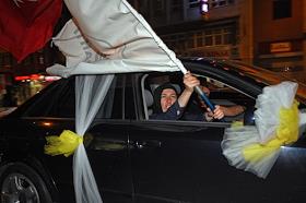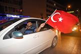 Turkish president election. Genre photo. Recep Tauyyip Erdogan supperters with flags in a car.