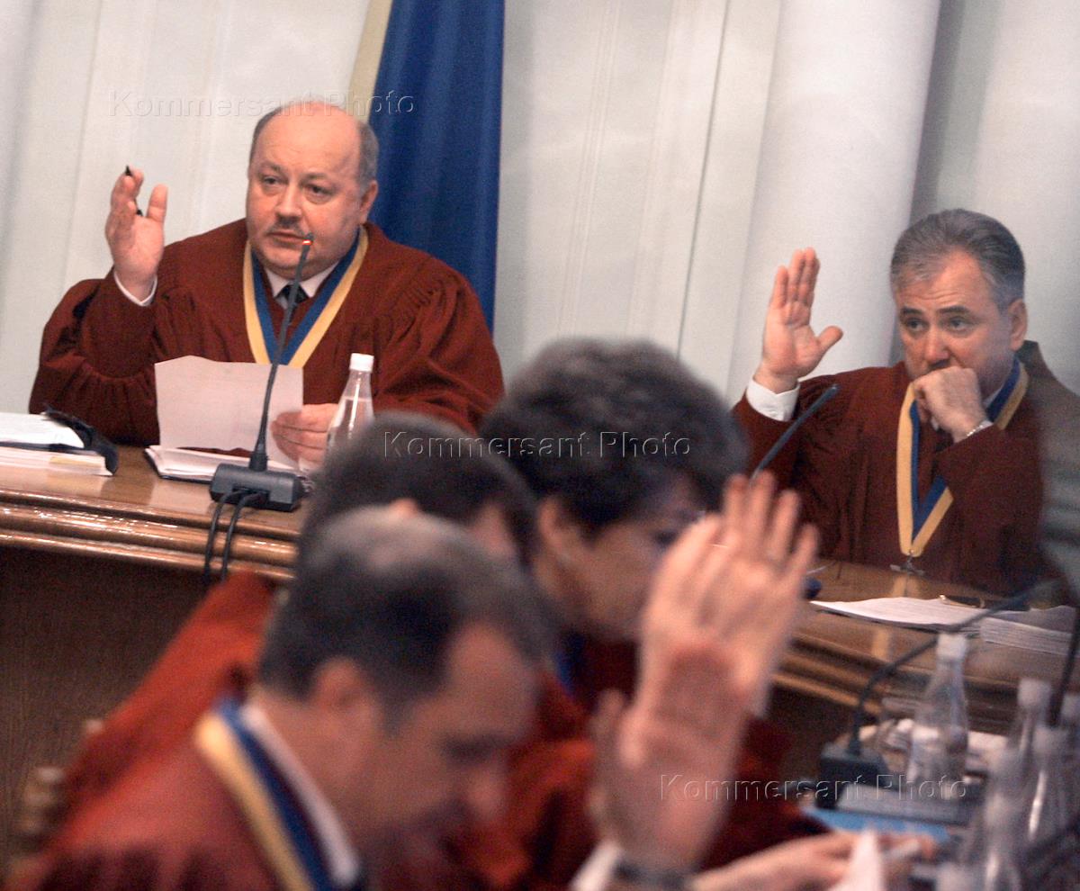 Президентские выборы на Украине. Заседание Верховного суда Украины по рассмотрению жалобы оппозиции, добивающейся отмены результатов второго тура президентских выборов. На столе лежит том "Конституция Украины" и блокнот "За Януковича".
