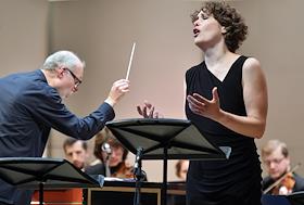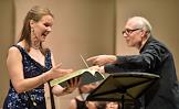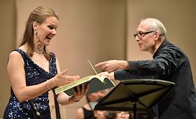 Концертное исполнение оперы "Оттон" композитора Георга Фридриха Генделя в Концертном зале имени П.И. Чайковского. Дирижер Кристофер Мулдс (справа) и оперная певица Джоан Ланн (слева) во время исполнения.