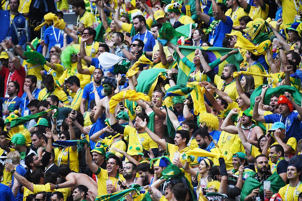 Чемпионат мира по футболу в России FIFA-2018. Групповой этап. Матч между сборными командами Бразилии и Коста Рики на стадионе "Санкт-Петербург". Болельщики сборной Бразилии на трибуне во время матча.