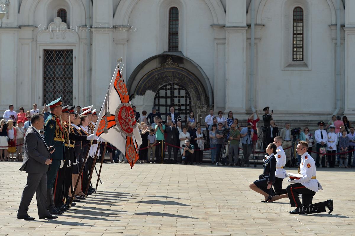 Церемония выпуска воспитанников Московского кадетского корпуса "Пансион воспитанниц Министерства обороны РФ", Московского суворовского военного училища и Московского военно-музыкального училища на Соборной площади Московского Кремля.