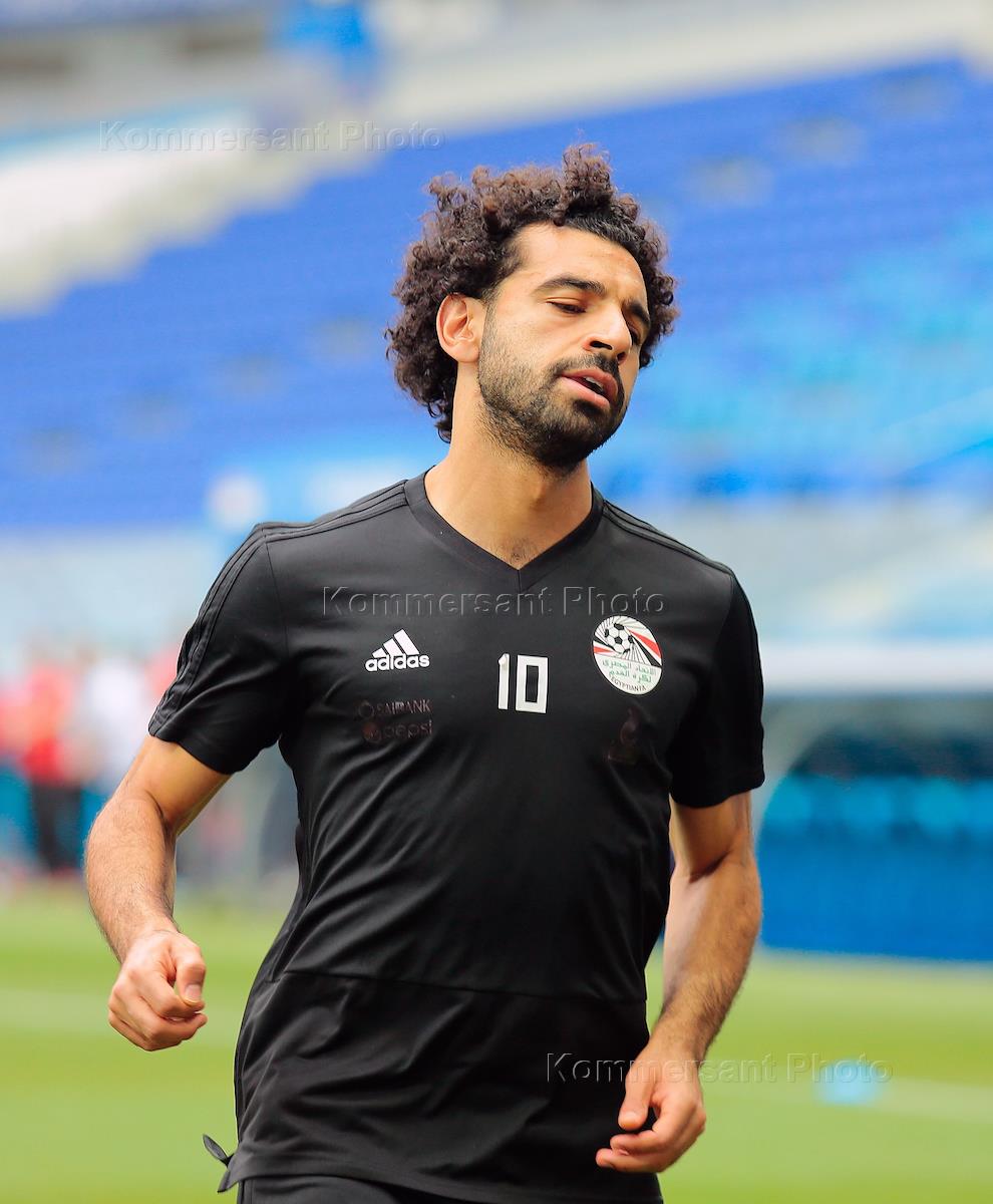 Чемпионат мира по футболу в России FIFA-2018. Групповой этап. Открытая тренировка сборной Египта перед матчем со сборной Саудовской Аравии прошла на стадионе "Волгоград Арена". Игрок сборной Египта Мозамед Салах во время тренировки.