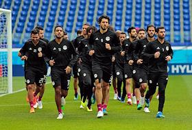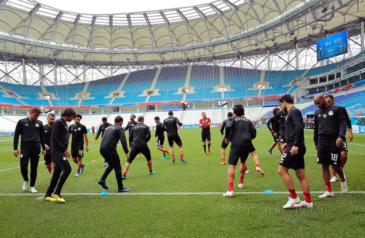 Чемпионат мира по футболу в России FIFA-2018. Групповой этап. Открытая тренировка сборной Египта перед матчем со сборной Саудовской Аравии прошла на стадионе "Волгоград Арена". Игроки сборной Египта во время тренировки.