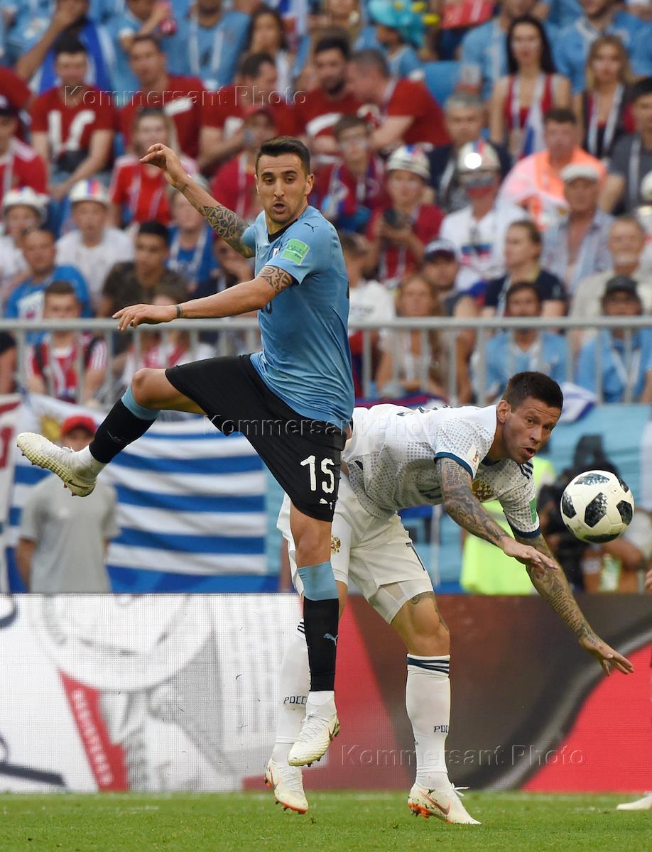 Чемпионат мира по футболу в России FIFA 2018. Групповой этап. Матч между сборными Уругвая и России прошел на стадионе "Самара Арена". Игрок сборной России Игорь Смольников (справа) и игрок сборной Уругвая Диего Ласкальт (слева) во время матча.