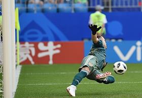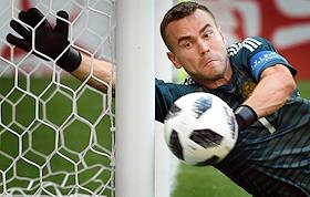 Чемпионат мира по футболу в России FIFA 2018. Групповой этап. Матч между сборными Уругвая и России прошел на стадионе "Самара Арена". Вратарь сборной России Игорь Акинфеев (слева) во время матча.