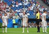 Чемпионат мира по футболу в России FIFA 2018. Групповой этап. Матч между сборными Уругвая и России прошел на стадионе "Самара Арена". Игроки сборной России Роман Зобнин (слева), Юрий Газинский (второй слева), Илья Кутепов (справа) и арбитр Маланг Дьедиу (второй справа) во время матча.