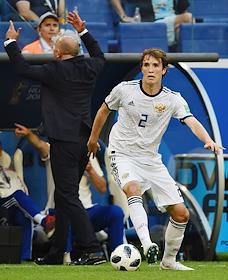 Чемпионат мира по футболу в России FIFA 2018. Групповой этап. Матч между сборными Уругвая и России прошел на стадионе "Самара Арена". Игрок сборной России Игорь Смольников (слева) во время матча.