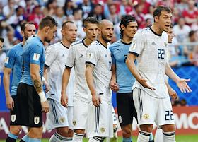 Чемпионат мира по футболу в России FIFA 2018. Групповой этап. Матч между сборными Уругвая и России прошел на стадионе "Самара Арена". Справа налево: игроки сборной России Артем Дзюба, Роман Зобнин, Илья Кутепов, Сергей Игнашевич и игрок сборной Уругвая Мартин Касарес во время матча.