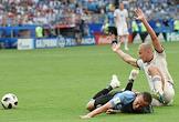 Чемпионат мира по футболу в России FIFA 2018. Групповой этап. Матч между сборными Уругвая и России прошел на стадионе "Самара Арена". Игрок сборной России Артем Дзюба (справа) и игрок сборной Уругвая Матиас Весино (слева) во время матча.