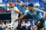 Чемпионат мира по футболу в России FIFA 2018. Групповой этап. Матч между сборными Уругвая и России на стадионе "Самара Арена". Игрок сборной России Сергей Игнашевич (справа) и игрок сборной Уругвая Луис Суарес (слева) во время матча.