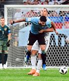 Чемпионат мира по футболу в России FIFA 2018. Групповой этап. Матч между сборными Уругвая и России прошел на стадионе "Самара Арена". Игрок сборной России Артем Дзюба (справа) и игрок сборной Уругвая Себастьян Коатес (слева) во время матча.