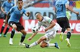Чемпионат мира по футболу в России FIFA 2018. Групповой этап. Матч между сборными Уругвая и России прошел на стадионе "Самара Арена". Игрок сборной России Далер Кузяев (слева) во время матча.