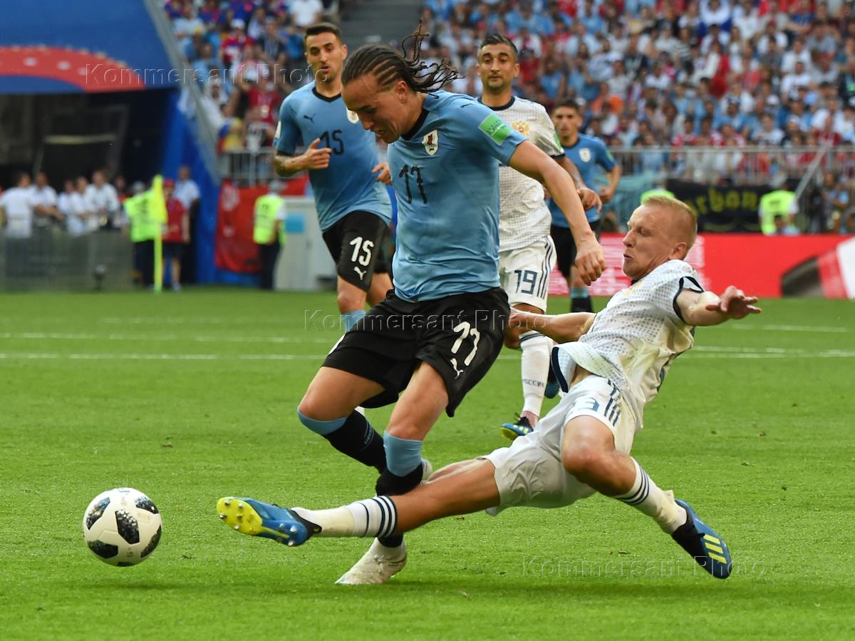 FIFA World Cup 2018 Russia. Group A. Russia v Uruguay at "Samara Arena" stadium. Russian football player Alexey Miranchuk (left) and Uruguayan football player Naithan Nandez (right) during the match.