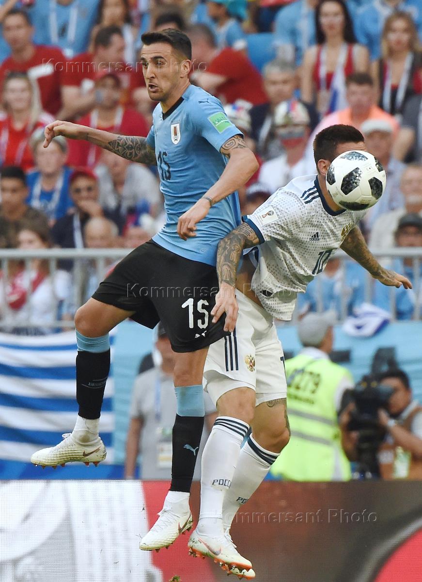 Чемпионат мира по футболу в России FIFA 2018. Групповой этап. Матч между сборными Уругвая и России прошел на стадионе "Самара Арена". Игрок сборной России Игорь Смольников (справа) и игрок сборной Уругвая Диего Ласкальт (слева) во время матча.
