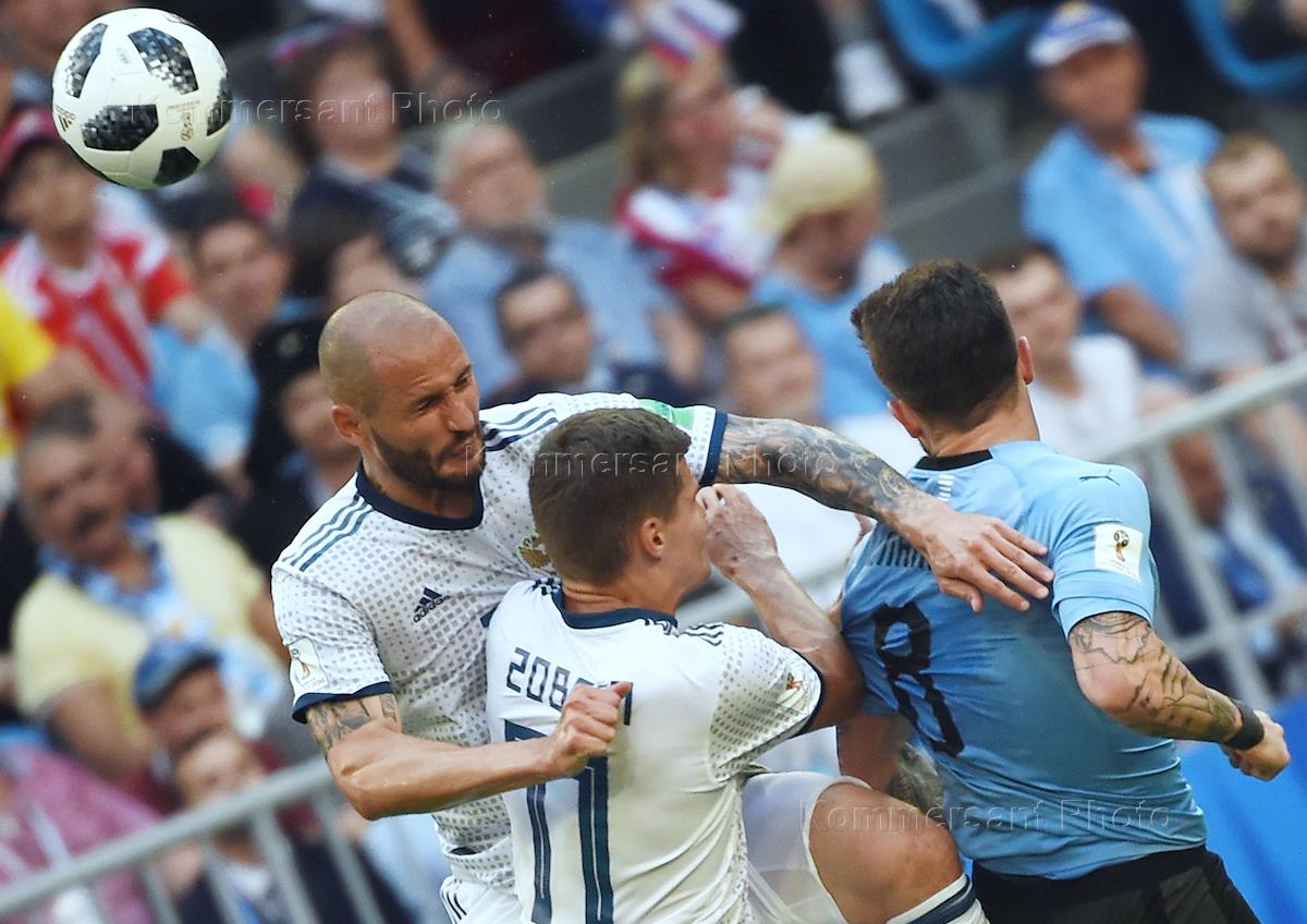 Чемпионат мира по футболу в России FIFA 2018. Групповой этап. Матч между сборными Уругвая и России прошел на стадионе "Самара Арена". Игрок сборной России Игорь Смольников (слева), игроки сборной Уругвая Диего Ласкальт (справа) и Матиас Весино (в центре) во время матча.