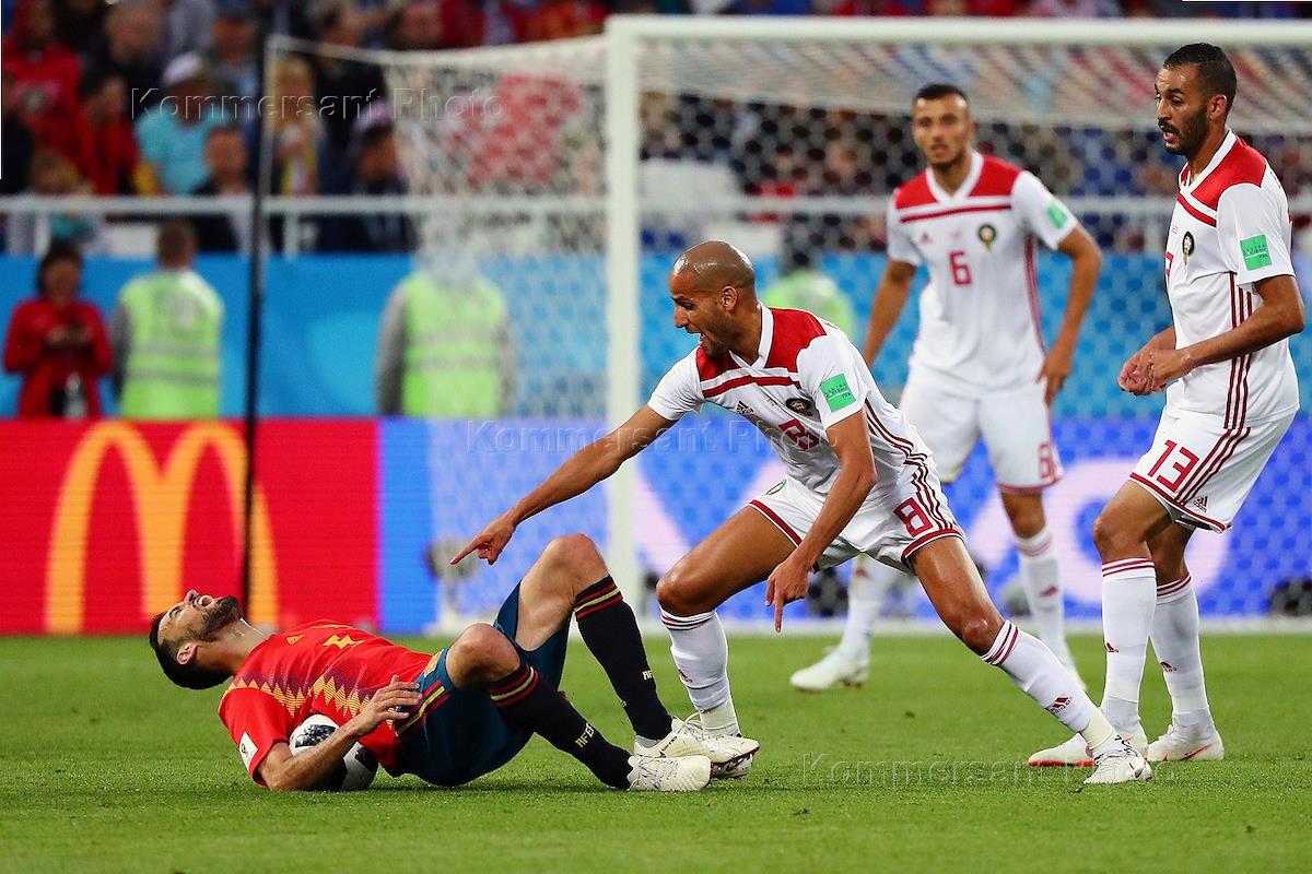 Чемпионат мира по футболу в России FIFA-2018. Групповой этап. Матч между сборными Испании и Марокко на стадионе "Калининград". Игрок сборной Марокко Нордин Амрабат (в центре) во время матча.