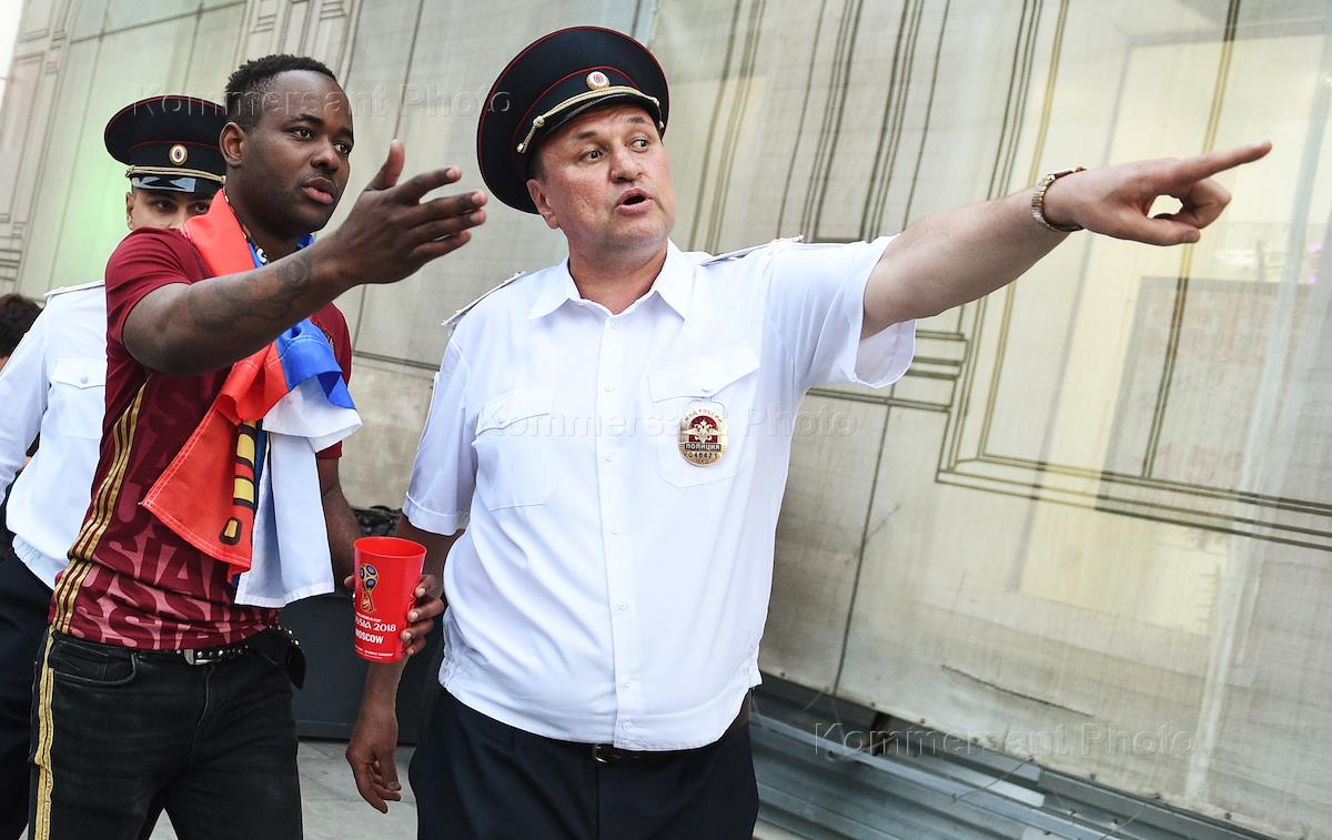 Чемпионат мира по футболу в России FIFA-2018. Сотрудник полиции объясняет иностранному болельщику направление следования.