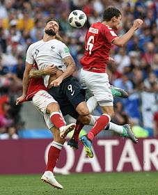 Чемпионат мира по футболу в России FIFA-2018. Групповой этап. Матч между сборными командами Дании и Франции на стадионе "Лужники". Игрок сборной Франции Оливье Жиру (слева) и игрок сборной Дании Симон Кьер (справа) во время матча.