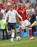 Чемпионат мира по футболу в России FIFA 2018. Групповой этап. Матч между сборными командами Франции и Дании на стадионе "Лужники". Игрок сборной Дании Симон Кьер (справа) во время матча.
