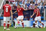Чемпионат мира по футболу в России FIFA-2018. Групповой этап. Матч между сборными командами Дании и Франции на стадионе "Лужники". Игрок сборной Дании Пионе Систо (в центре) во время матча.