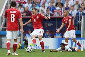 Чемпионат мира по футболу в России FIFA 2018. Групповой этап. Матч между сборными командами Франции и Дании на стадионе "Лужники". Игрок сборной Дании Томас Дилейни (слева) во время матча.