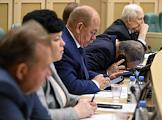 Заседание Совета Федерации (СФ) России. Представитель в СФ России от законодательного (представительного) органа государственной власти Астраханской области Геннадий Орденов (третий слева) и представитель в СФ России от исполнительного органа государственной власти Астраханской области Александр Башкин (справа) во время заседания.