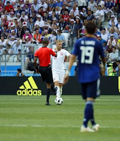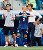 Чемпионат мира по футболу в России FIFA 2018. Групповой этап. Матч между сборными командами Японии и Польши на стадионе "Волгоград Арена". Главный тренер сборной Японии Нисино Акира и игрок сборной Японии Юто Нагатомо (в центре) во время матча.