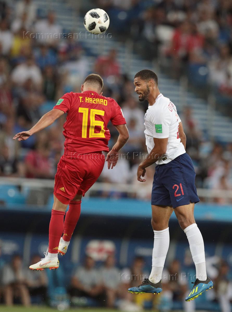 Чемпионат мира по футболу в России FIFA-2018. Групповой этап. Матч между сборными командами Англии и Бельгии на стадионе "Калининград". Игрок сборной Англии Рубен Лофтус-Чик (справа) и игрок сборной Бельгии Торган Азар (слева) во время матча.