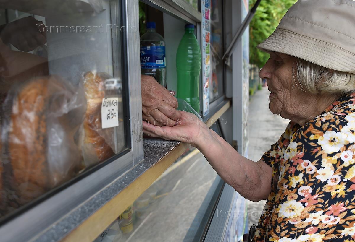Жанровая фотография. Пожилая женщина с кошельком у продуктовой палатки.