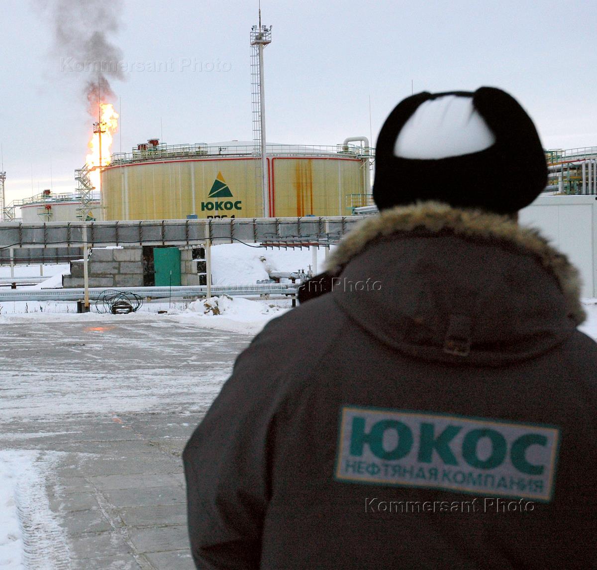 Здание нефтяной компании "ЮКОС" в городе Нефтеюганске. Надпись "ЮКОС" на куртке рабочего.
