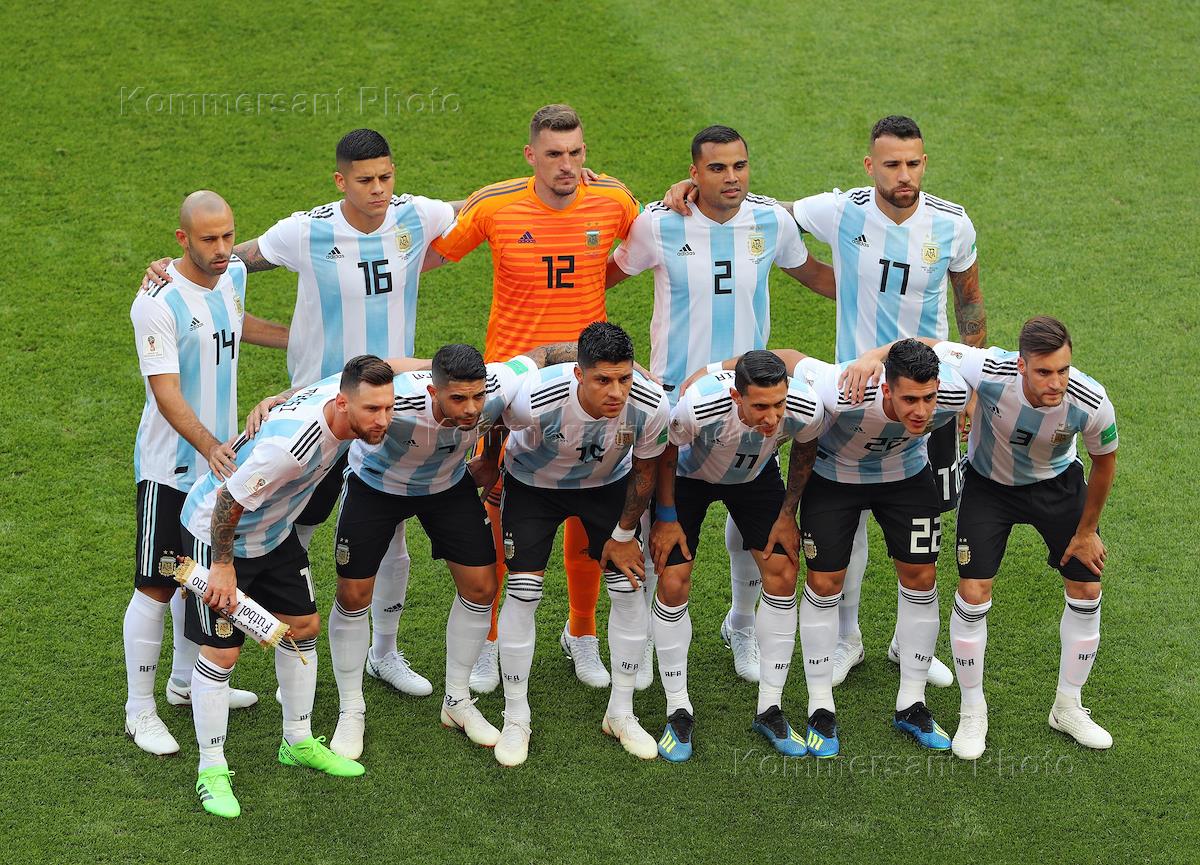 Чемпионат Мира по футболу в России FIFA 2018. 1/8 финала. Матч между сборными Франции и Аргентины на стадионе "Казань Арена". Игроки сборной Аргентины перед началом матча.