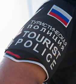 Чемпионат Мира по футболу в России FIFA 2018. 1/8 финала. Матч между сборными Уругвая и Португалии на стадионе "Фишт". Сотрудник туристической полиции перед началом матча.