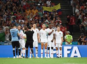 Чемпионат мира по футболу в России FIFA 2018. 1/8 финала. Матч между сборными командами Уругвая и Португалии на стадионе "Фишт". Игроки сборной Уругвая перед началом матча.