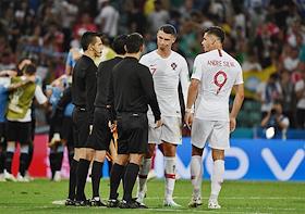Чемпионат мира по футболу в России FIFA 2018. 1/8 финала. Матч между сборными командами Уругвая и Португалии на стадионе "Фишт". Игрок сборной Португалии Криштиану Роналду (в центре) во время матча.
