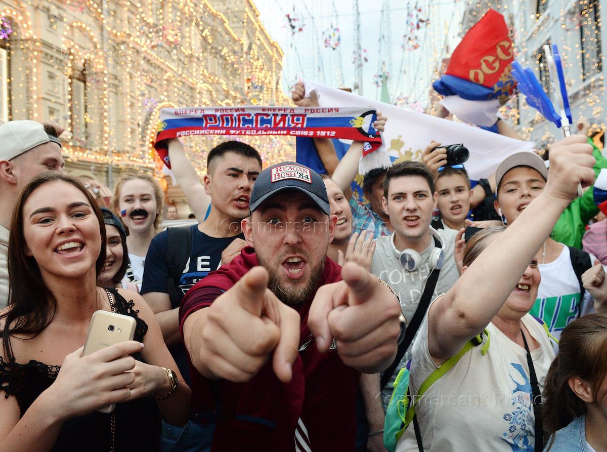 Чемпионат мира по футболу в России FIFA 2018. 1/8 финала. Гуляния болельщиков сборной России на Никольской улице после победы сборной России в матче со сборной Испании.