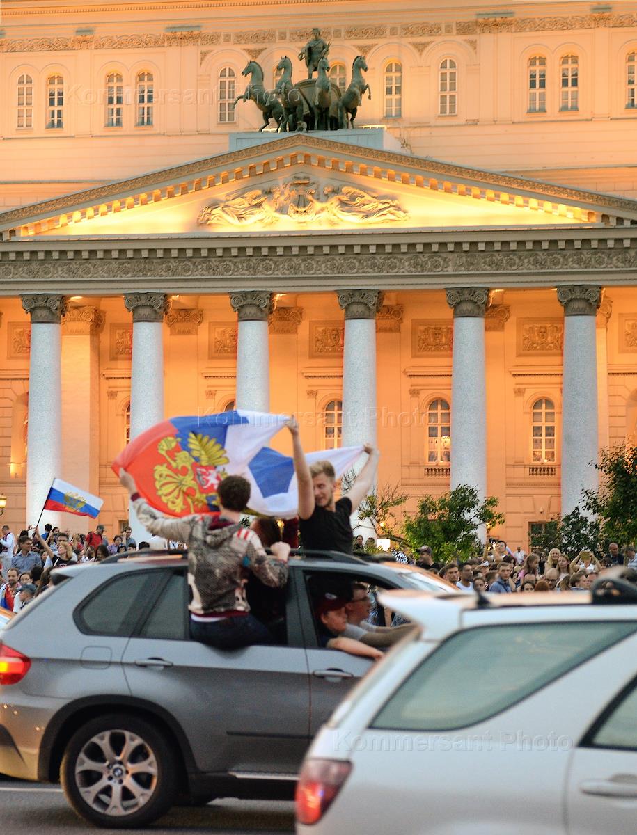 Чемпионат мира по футболу в России FIFA 2018. 1/8 финала. Матч между сборными Испании и России прошел на стадионе "Лужники". Болельщики празднуют победу сборной России на Никольской улице.