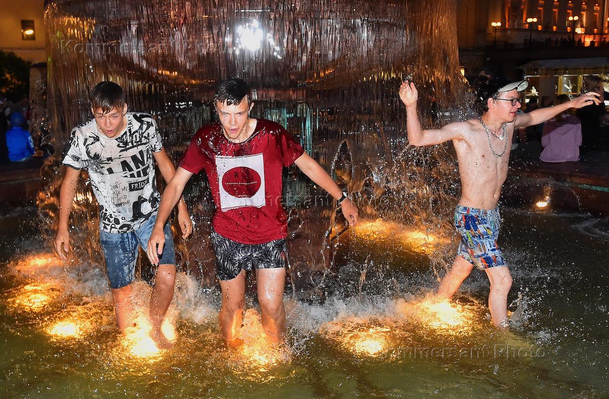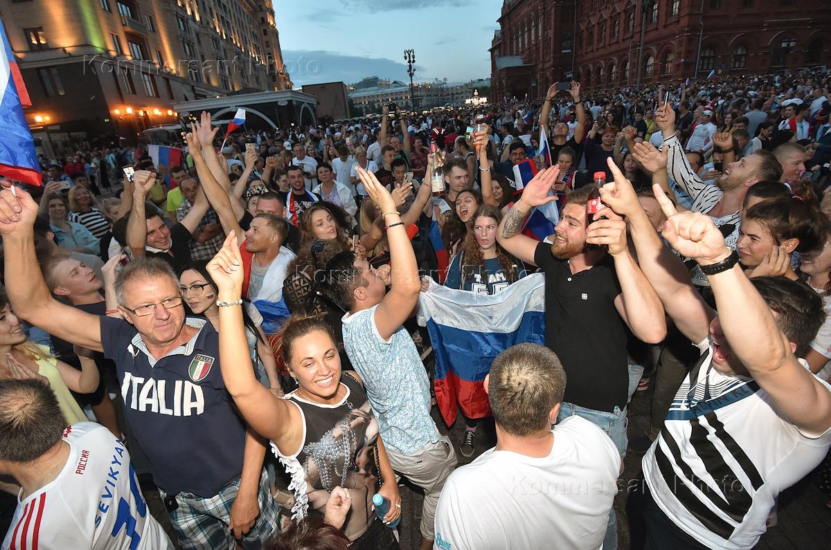 Чемпионат мира по футболу в России FIFA 2018. 1/8 финала. Матч между сборными командами России и Испании на стадионе "Лужники". Болельщики на Манежной площади празднуют победу сборной комнады России.